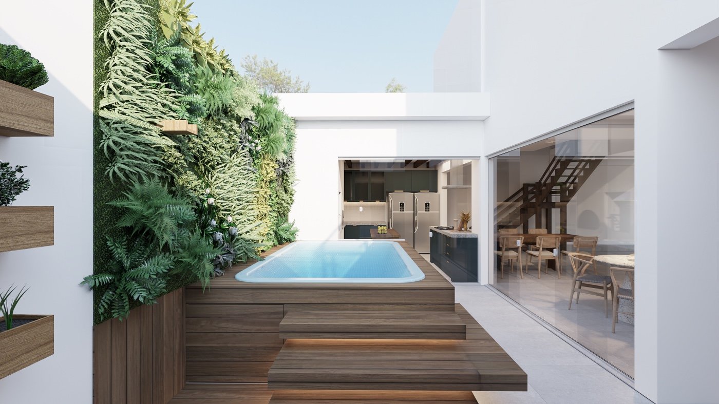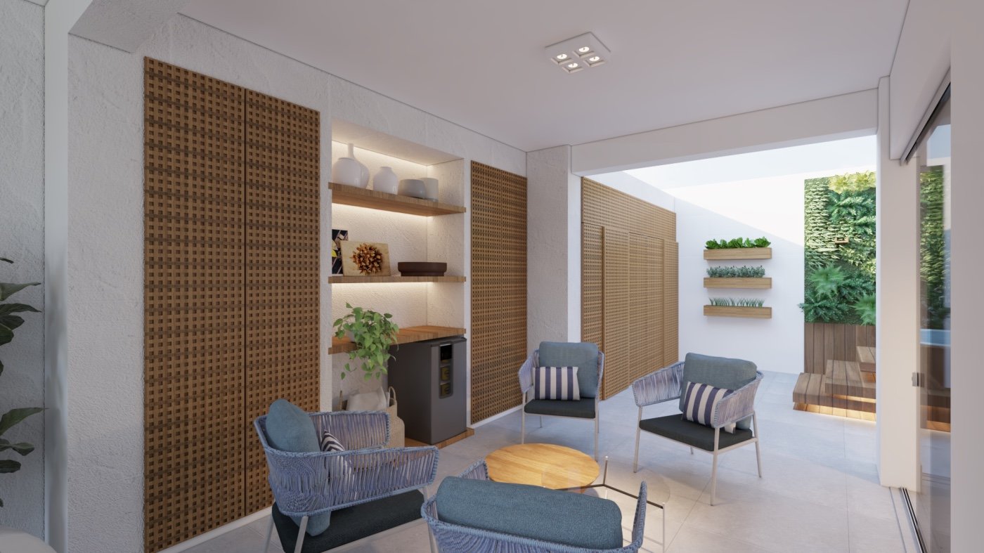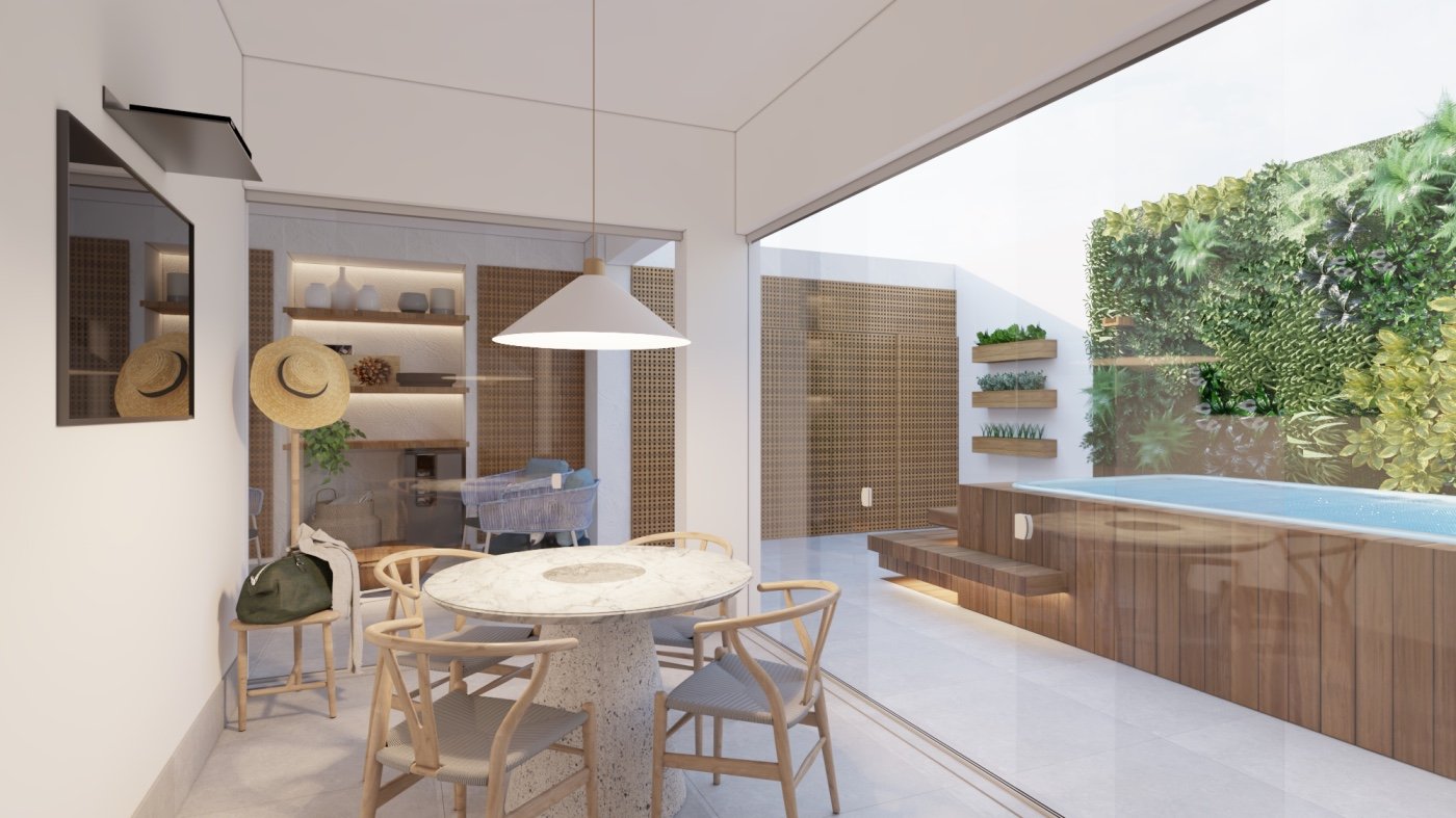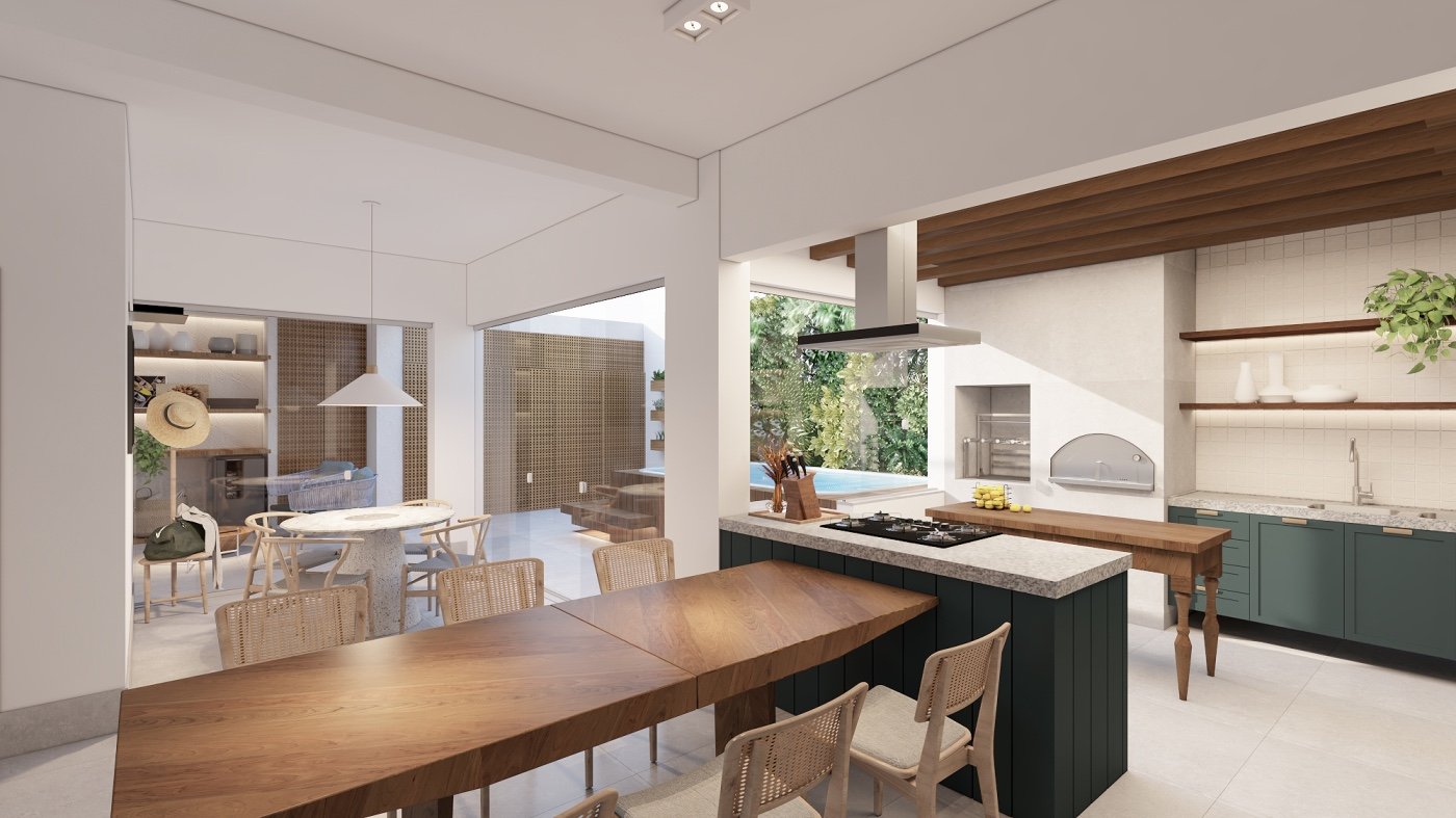 “Essa casa de praia foi projetada com foco na integração entre interior e exterior. A suíte e o banheiro foram planejados para oferecer um ambiente de descanso, enquanto a área gourmet e a sala de jantar têm vista para uma área externa com piscina e parede verde, criando um espaço de convivência relaxante.” — Imagens 3D autoral