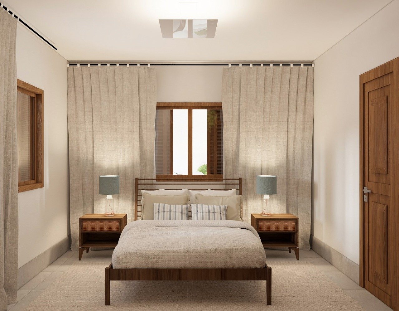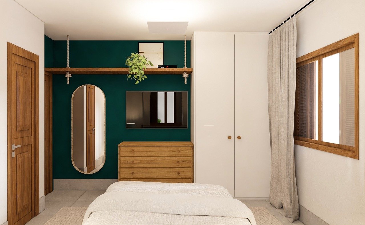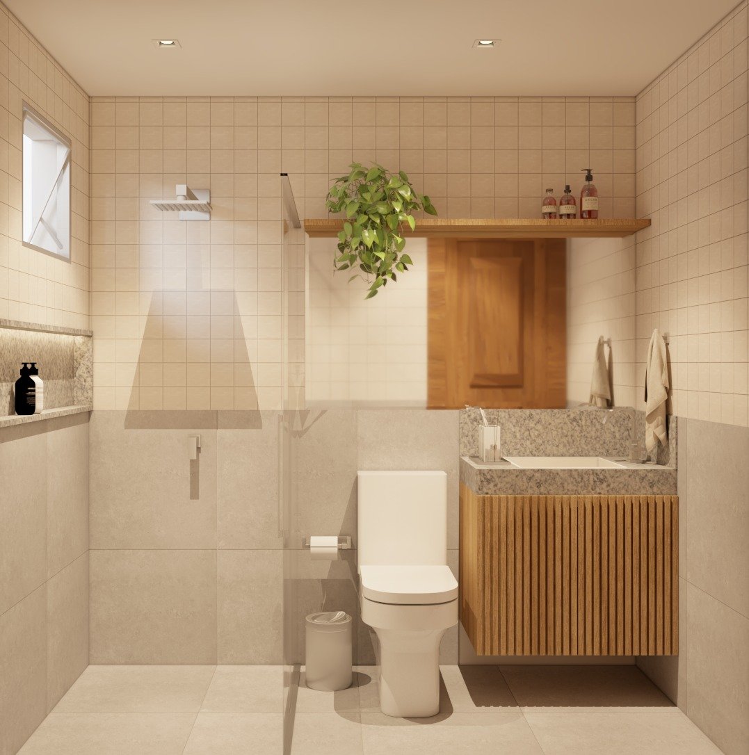 “Essa casa de praia foi projetada com foco na integração entre interior e exterior. A suíte e o banheiro foram planejados para oferecer um ambiente de descanso, enquanto a área gourmet e a sala de jantar têm vista para uma área externa com piscina e parede verde, criando um espaço de convivência relaxante.” — Imagens 3D autoral