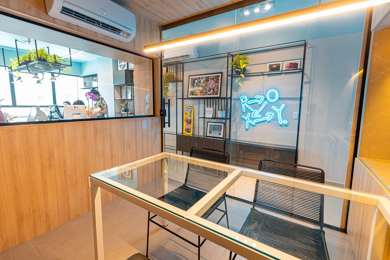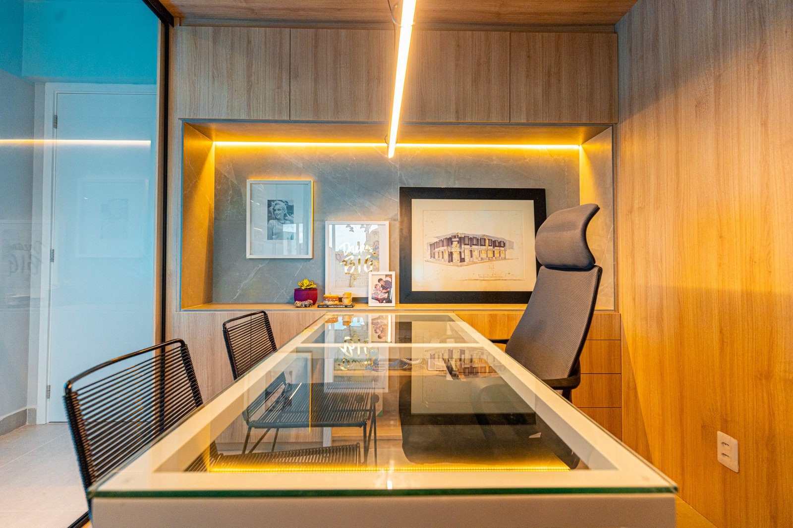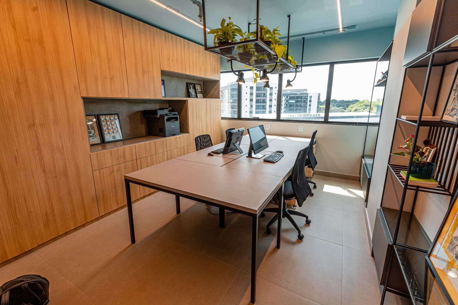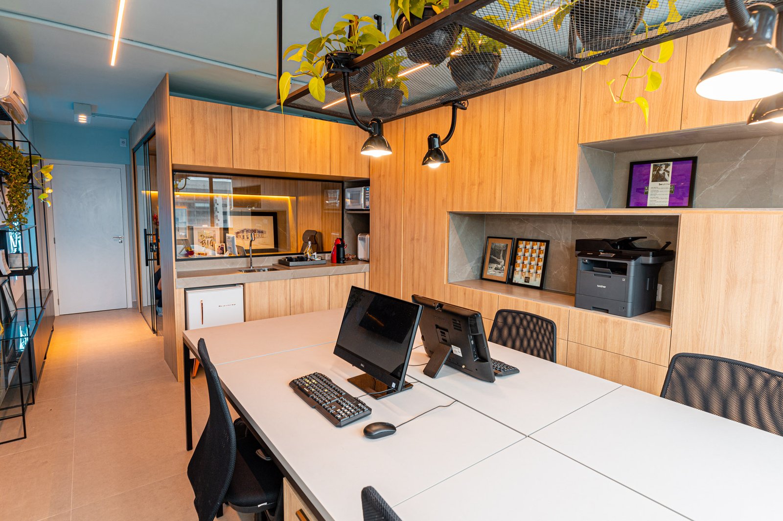 “O projeto do escritório Roxy utiliza uma paleta de tons neutros com um toque de azul no teto, criando um ambiente de trabalho moderno e sofisticado. A combinação de branco, cinza e amadeirado traz elegância e profissionalismo ao espaço.”