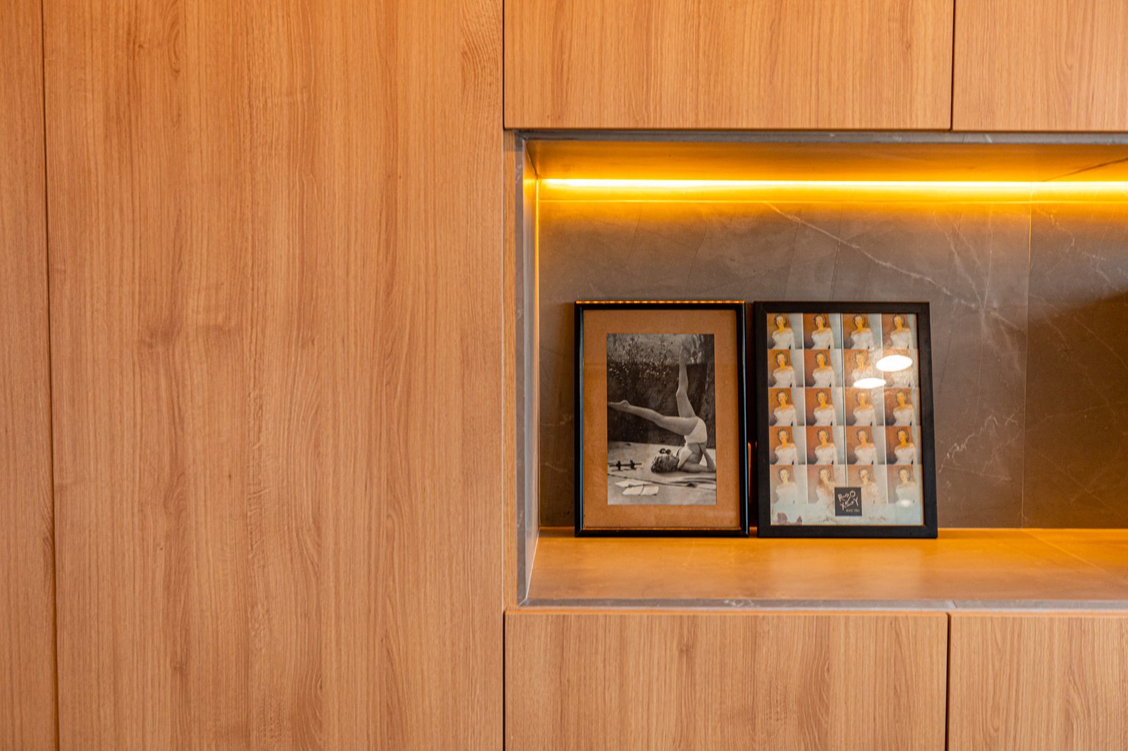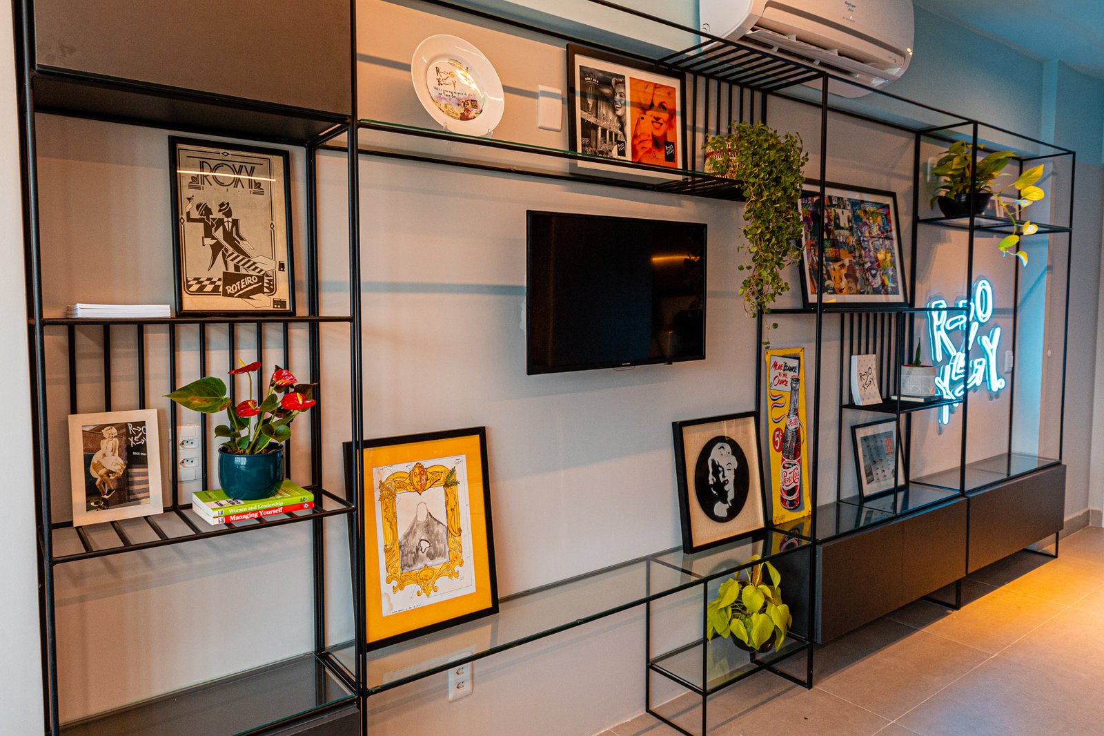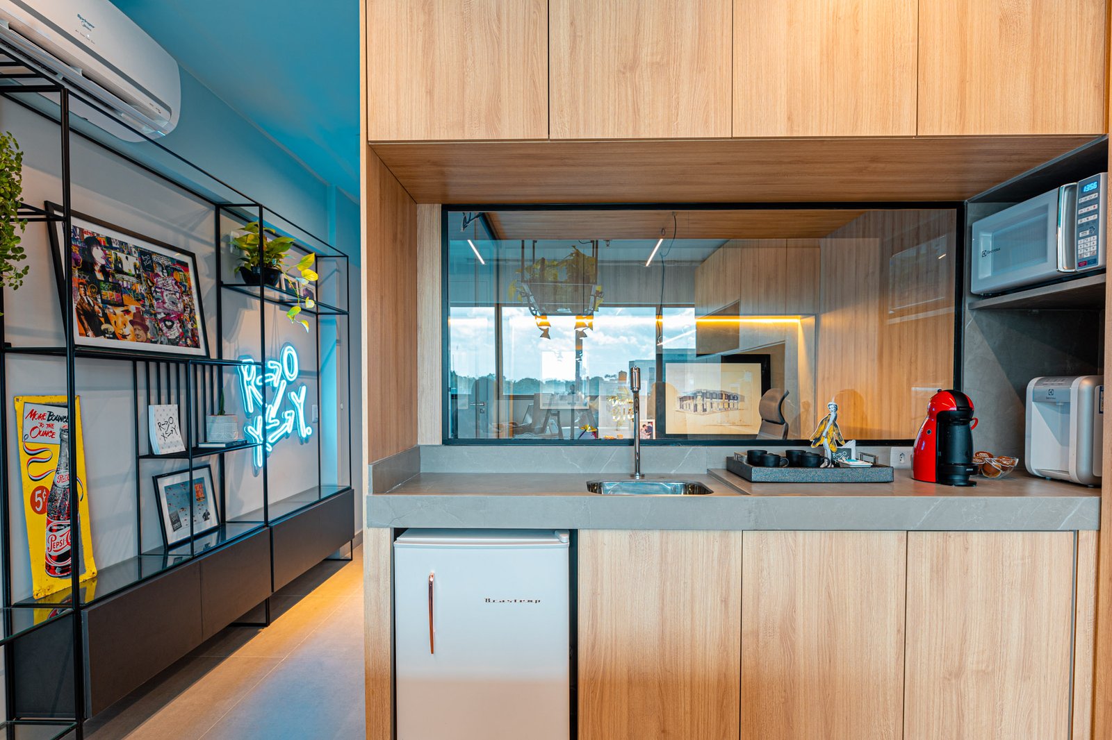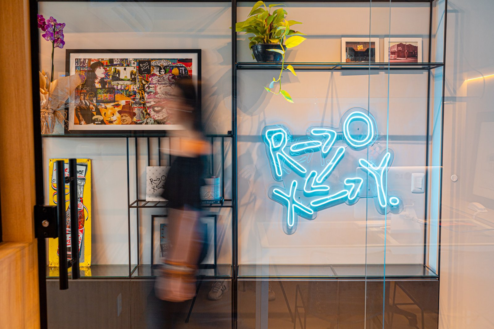 “O projeto do escritório Roxy utiliza uma paleta de tons neutros com um toque de azul no teto, criando um ambiente de trabalho moderno e sofisticado. A combinação de branco, cinza e amadeirado traz elegância e profissionalismo ao espaço.”