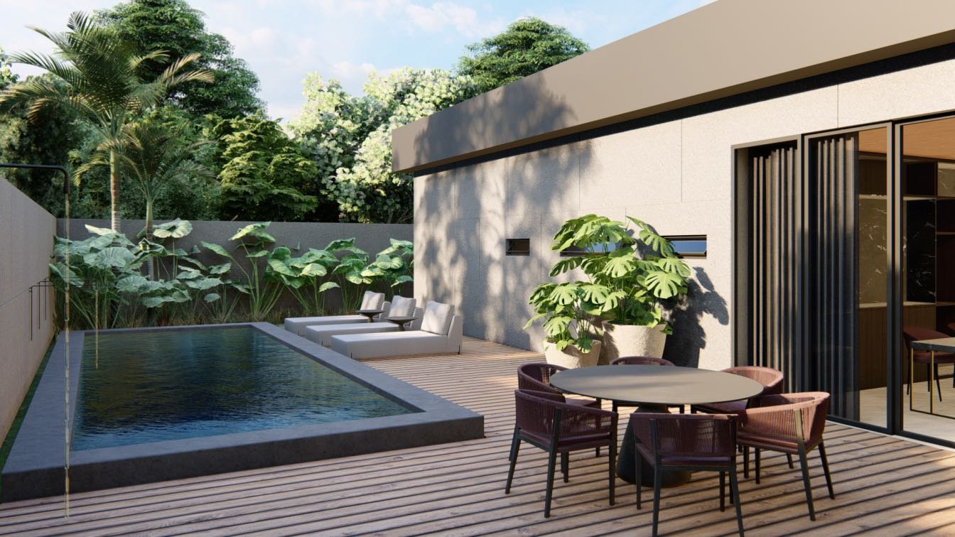 “Esse projeto inclui uma área externa agradável, fachada moderna, e interiores funcionais com escritório, sala de estar, jantar, área gourmet e lavabo, atendendo às necessidades dos moradores com elegância.”
