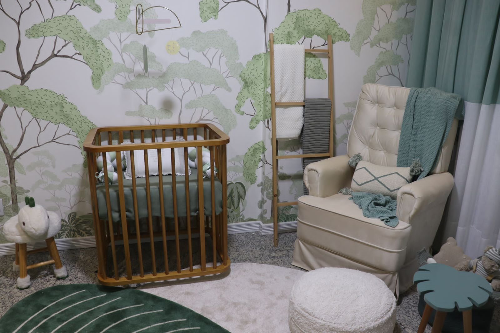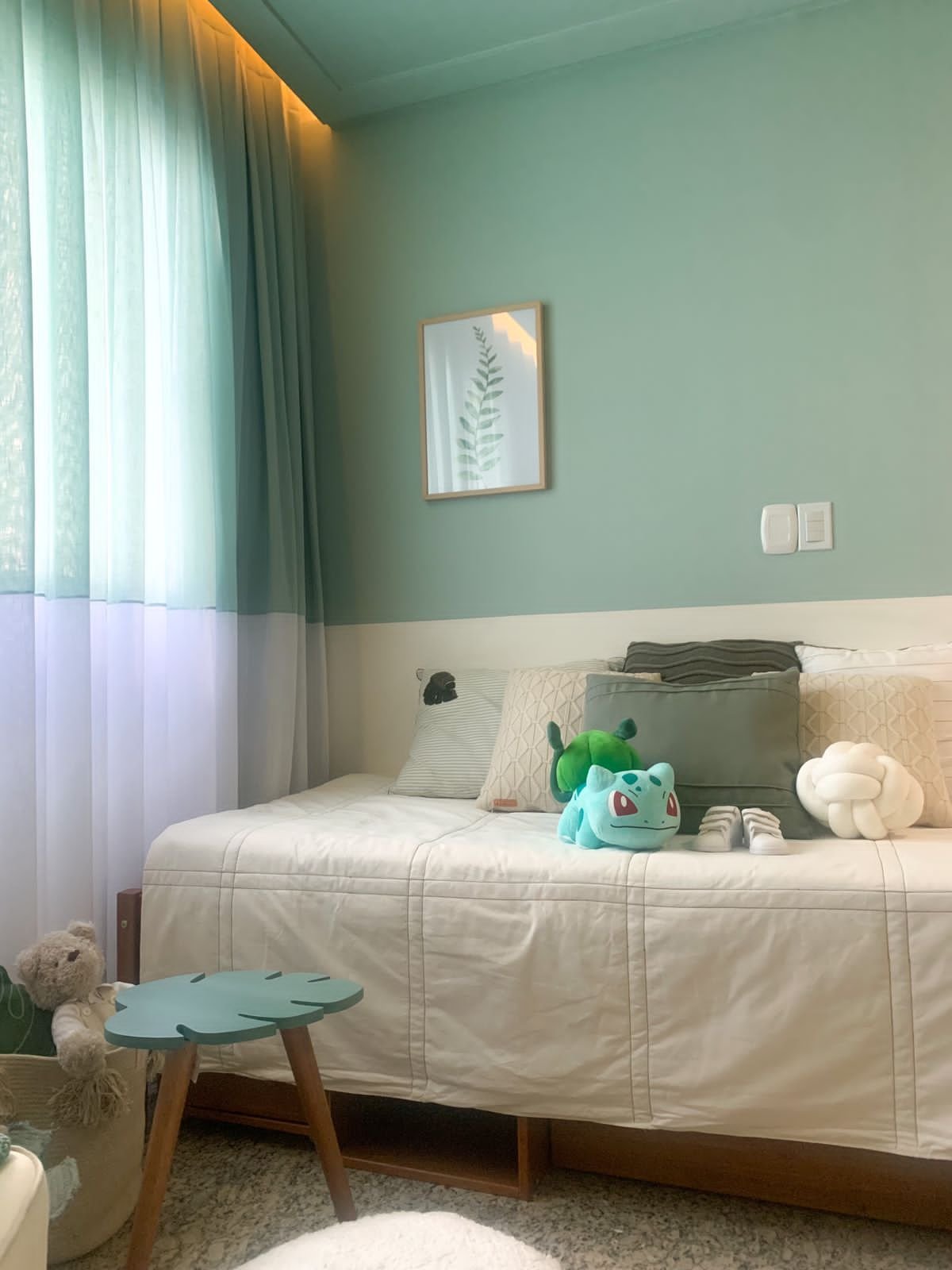 PROJETO_011_QMC “Quarto de bebê inspirado em um pokemon retratando o seu habitat da floresta, decorado em tons de branco, amadeirado e verde, criando um ambiente tranquilo e acolhedor, ideal para o descanso e desenvolvimento da criança.”— Fotos: Autoral