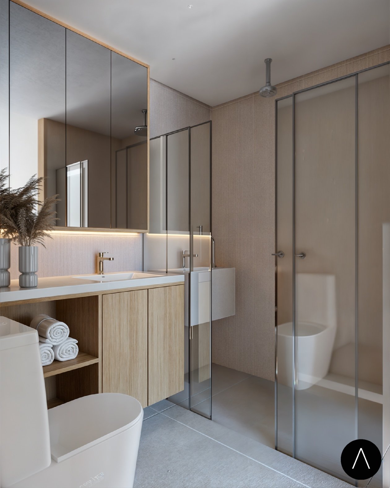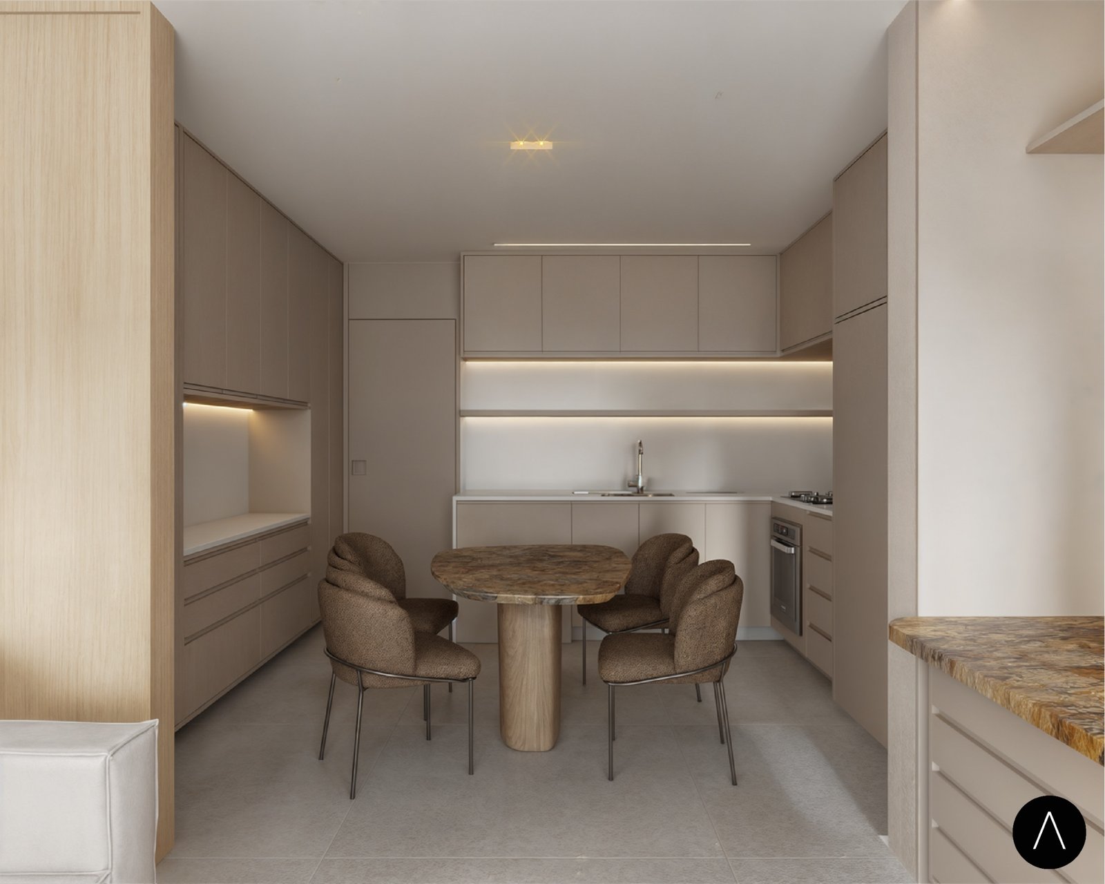 “Apartamento em tons neutros que prioriza conforto e sofisticação discreta. Cada ambiente foi cuidadosamente planejado para equilibrar funcionalidade e estética, incluindo detalhes práticos, como um tanque sutilmente integrado ao box do banheiro para maior funcionalidade. “ — Imagens 3D autoral