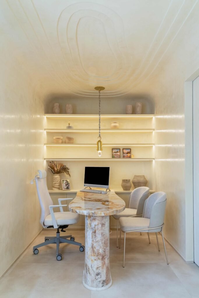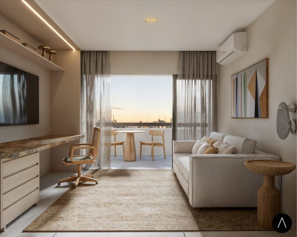 O escritório realiza projetos residenciais, comerciais e institucionais, sempre com foco no conforto, na sofisticação e no uso sustentável de materiais. O minimalismo é incorporado em seus ambientes, criando espaços funcionais, elegantes e equilibrados, onde cada detalhe tem um propósito claro, reforçando a sensação de amplitude e harmonia.